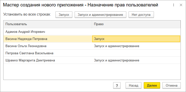 Нажать кнопку Далее. Будет предложено назначить права пользователей Запуск или Запуск и администрирование для создаваемого приложения: