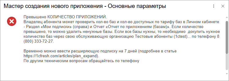 Наиболее часто встречающаяся причина невозможности добавить приложение — превышение количества приложений, разрешенного имеющимися у абонента подписками на тарифы сервиса. Например, по тарифам КОРП разрешено использование только двух приложений «Комплексная автоматизация», по тарифам уровня Базовый — одно приложение для работы и одно приложение того же вида для тестирования.