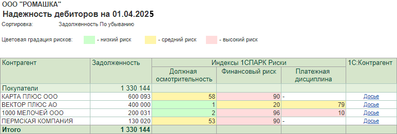 Специалисты обслуживающей организации продемонстрировали директору возможности сервиса «1СПАРК Риски», показав, как программа рассчитывает и визуализирует Индексы. Проверка и согласование условий сотрудничества стали занимать до 5 минут вместо 1 часа. А возможность проверять состояние индексов клиентов в программе 1С позволила пересмотреть часть условий по текущим контрагентам в сторону снижения рисков.