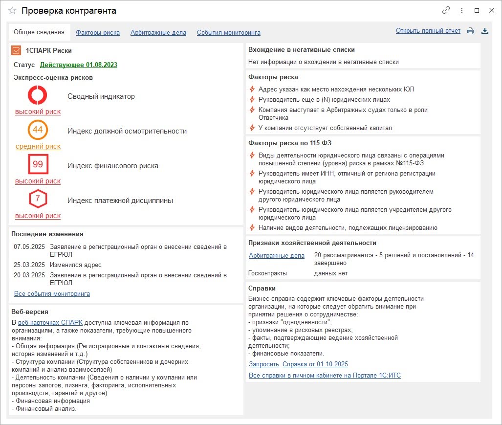 Новые проверки доступны во всех тарифах сервиса 1СПАРК Риски и уже включены в конфигурации: