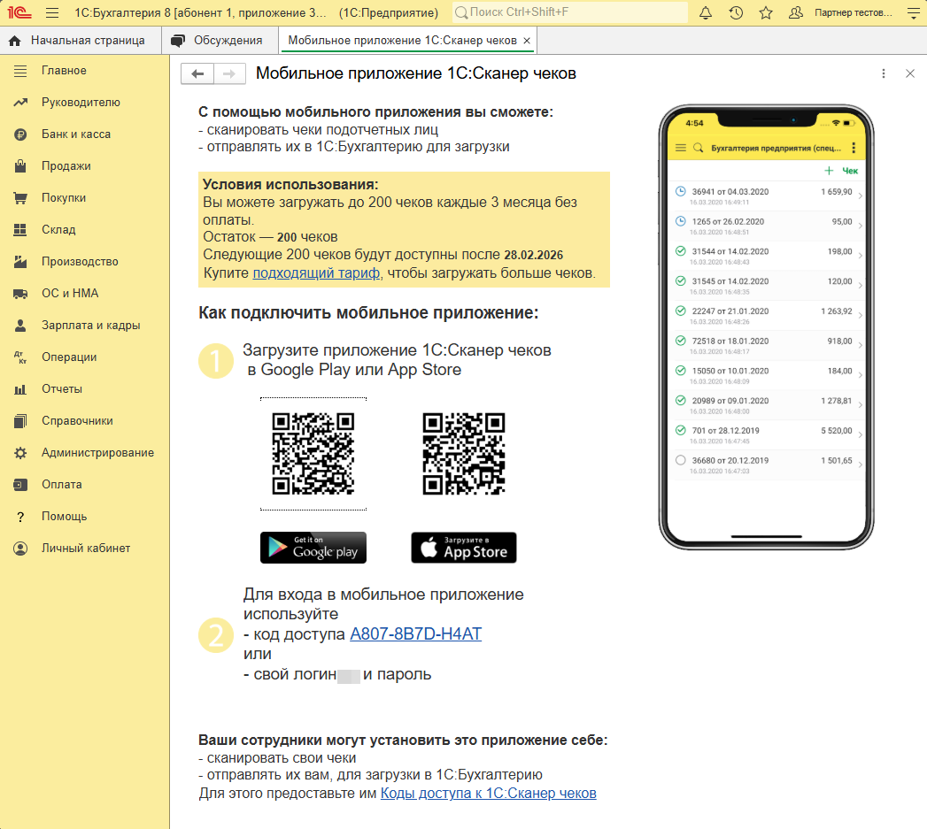 Для начала работы достаточно подключить «1С:Сканер чеков» в облачной программе, установить сотрудникам бесплатное мобильное приложение и настроить для них ограниченный доступ, позволяющий только сканировать и отправлять чеки. Бухгалтер при этом выбирает, какие документы включить в отчет.