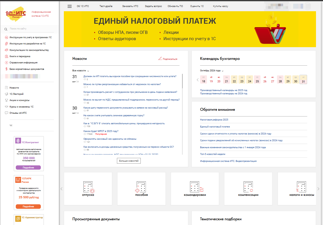 1С:ИТС объединяет материалы и экспертные рекомендации, полезные для бухгалтеров, кадровых специалистов, руководителей и IT-разработчиков. На портале собраны инструкции, справочники, обзоры изменений, калькуляторы и готовые ответы экспертов, охватывающие вопросы налогообложения, ведения учета, кадрового администрирования и работы с приложениями 1С. Например, материалы на самые «горячие» на момент публикации темы в новых разделах «Налоговая реформа-2026» и «Уплата НДС при УСН с 2026 года», а также разъяснения по снижению лимита доходов для предпринимателей на АУСН и порядку получения патента в 2026 году.