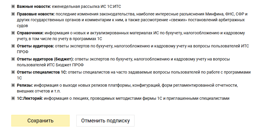 В разделе «Новости» с помощью кнопки «Подписаться» можно настроить рассылку по конкретным тематикам. Например, информация о вышедших обновлениях будет актуальна для it-специалиста, а изменения в законодательстве — руководителю и бухгалтерии.