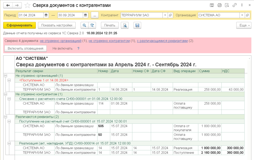 С помощью 1С:Сверки 2.0 можно автоматически проверить УПД, УКД, акты, накладные и банковские документы. Сервис сравнивает документы по основным параметрам — дате, номеру, сумме и НДС. Если все совпадает, отчет будет пустым. Если есть расхождения, они показываются отдельными группами: документ отсутствует у вас, отсутствует у контрагента или отличается по реквизитам. Из отчета можно сразу перейти к нужному документу и быстро исправить ошибку.