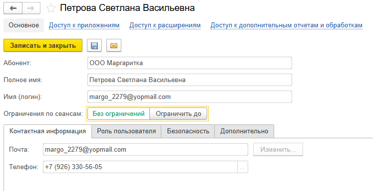 Задать или снять пользователю ограничения по сеансам | Только владелец | Кнопки Без ограничений и Ограничить до |
