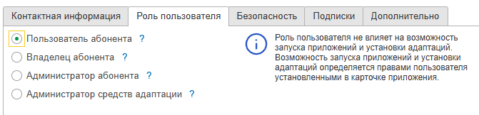 Владелец абонента может назначить пользователю роль по отношению к абоненту: Владелец абонента, Администратор абонента или Пользователь абонента.