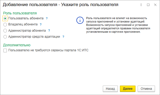 Если пользователя абонента добавляет администратор абонента, то этот шаг пропускается — новый пользователь всегда получает права пользователя абонента.
