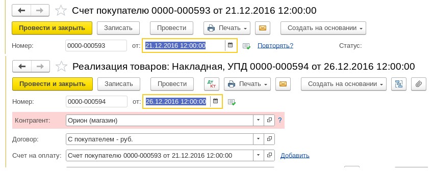 Документы по одному виду реализации должны быть введены по реквизиту «на основании» или с указанием реквизита «на основании» тогда, вся цепочка документов будет под одним номером.