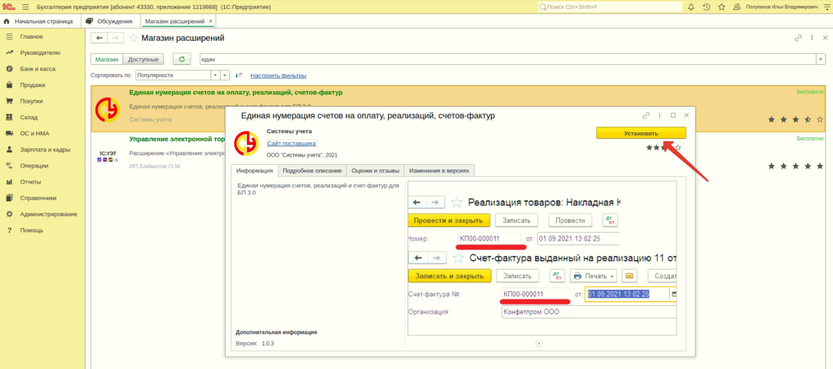 Расширение «Единая нумерация счетов на оплату, реализаций, счетов-фактур» можно установить в ваше приложение по прямой ссылке. Перейдите по этой ссылке и нажмите «Установить» в интересующей базе.