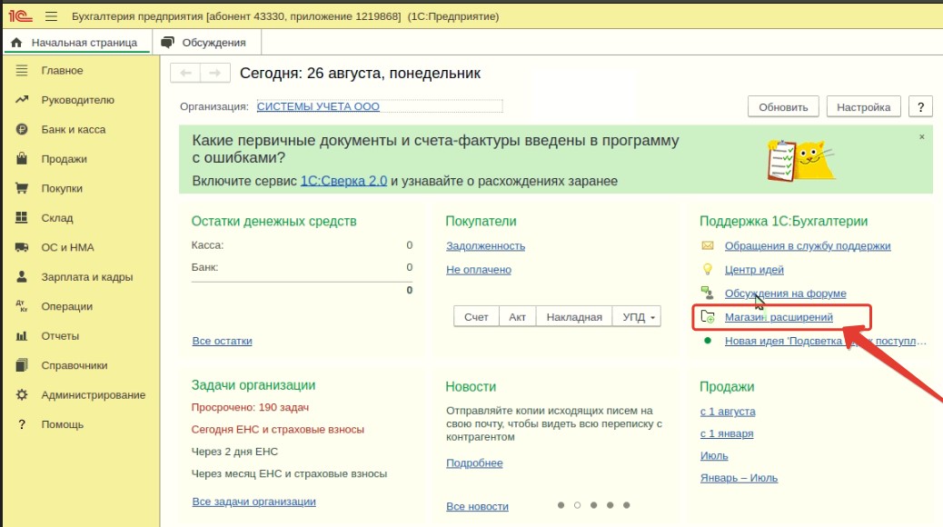 Ознакомиться с полным списком доступных расширений можно в 1С:Магазин расширений внутри каждой программы: запустите необходимое приложение, в меню «Главное» перейдите в «Магазин расширений» и выберите подходящее расширение из каталога для установки.