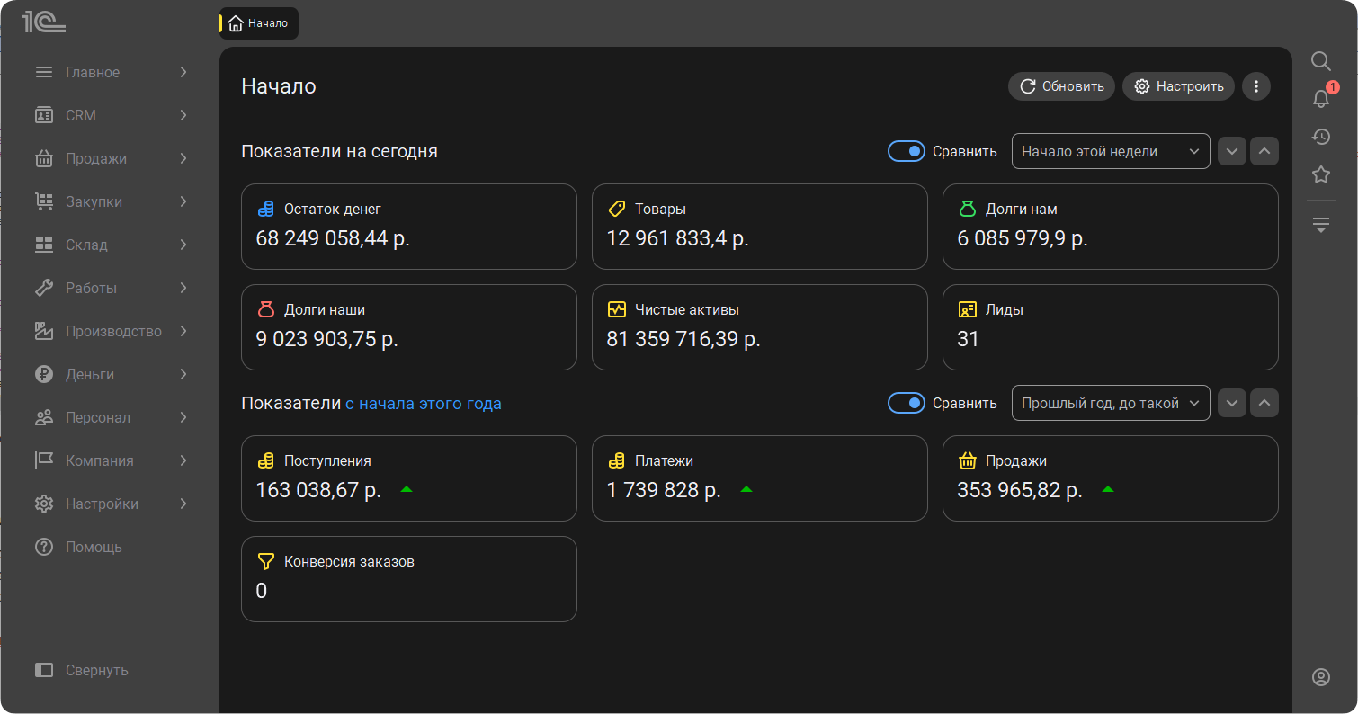 Сразу после запуска появляется начальная страница. На ней представлены ключевые показатели компании на сегодня и за выбранный период. Информация представлена в виде информативных карточек с цифрами, сгруппированных в три колонки, а также на крупных и ярких графиках. Справа от показателей отображаются новости и задачи пользователя, чтобы всегда быть в курсе нового и ничего не забыть.