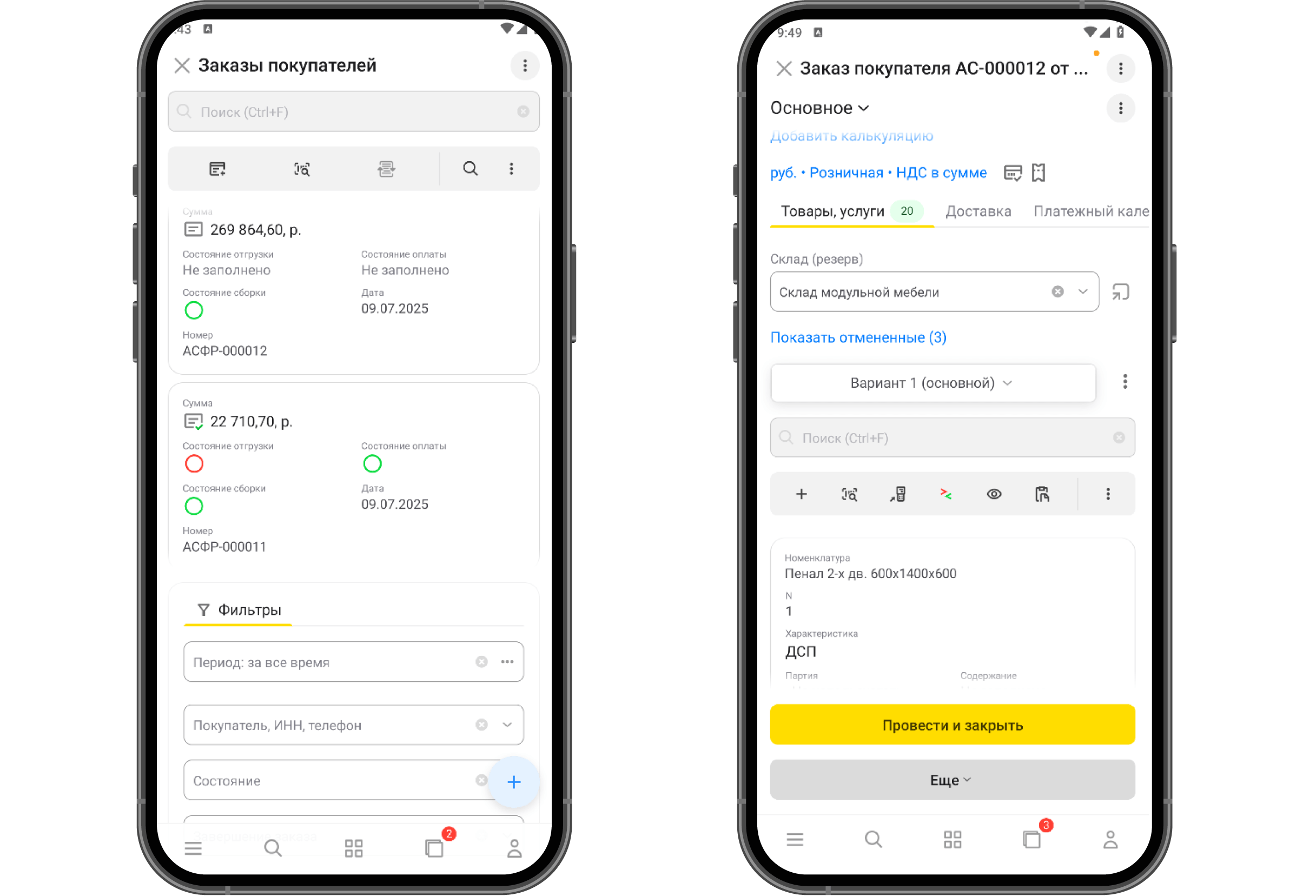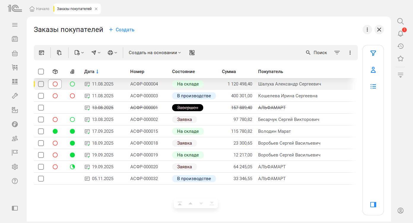 Вся информация распределена так, что не требуется пролистывать документы по горизонтали. Например, строки в списках представлены в виде карточек, в них доступна вся основная информация о документе.