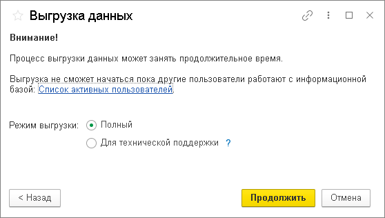Как правило, следует выбирать режим Полный. Режим Для технической поддержки применяется, если необходимо выполнить выгрузку большого приложения для разбора проблем или тестирования. Этот режим позволяет выполнить выгрузку быстрее и сформировать файл выгрузки меньшего размера, за счет того, что в этом режиме не выгружаются присоединенные файлы (картинки, документы), версии объектов и некоторые другие данные.