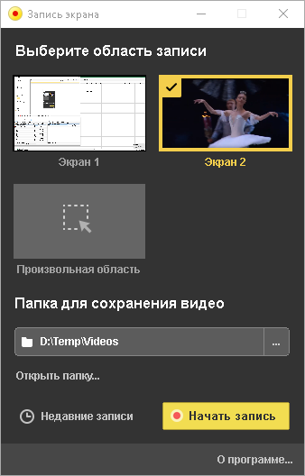 - В выведенном окне Запись экрана можно выбрать нужную папку для сохранения файлов видео (поле Папка для сохранения видео).