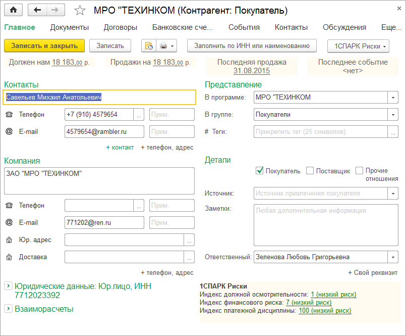 Специалисты обслуживающей организации продемонстрировали директору возможности сервиса «1СПАРК Риски», показав, как программа рассчитывает и визуализирует Индексы. Проверка и согласование условий сотрудничества стали занимать до 5 минут вместо 1 часа. А возможность проверять состояние индексов клиентов в программе 1С позволила пересмотреть часть условий по текущим контрагентам в сторону снижения рисков.