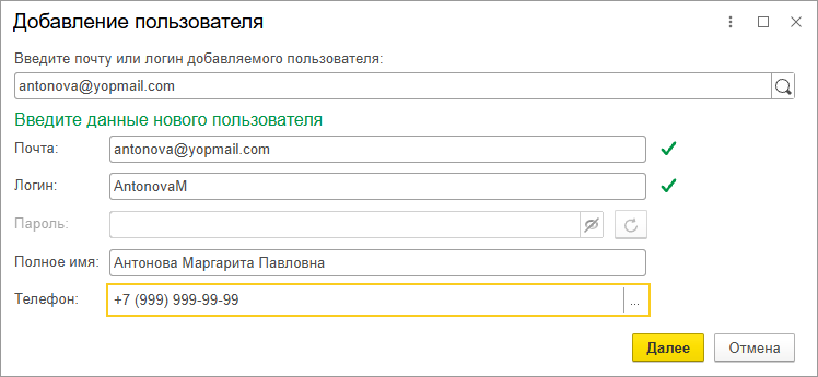 Если же при добавлении пользователя для него не была указана электронная почта, то необходимо сообщить добавленному пользователю его логин и пароль для работы в сервисе.