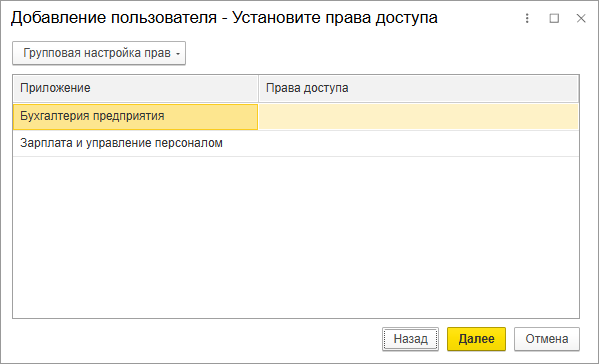 Далее необходимо указать права нового пользователя по отношению к приложениям абонента: