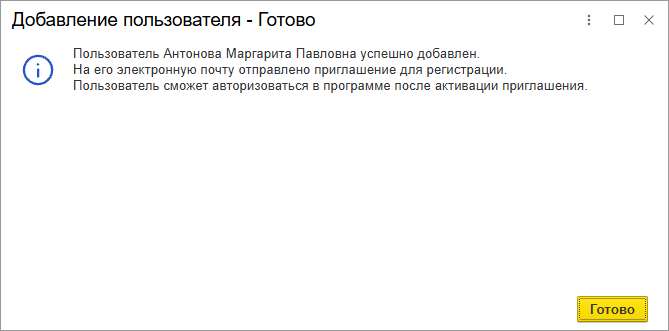 Если для пользователя была указана электронная почта, то в сообщении будет сказано, что пользователю направлено уведомление по электронной почте.
