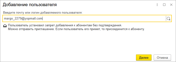 При попытке добавить к абоненту пользователя, который установил запрет добавления к абонентам без подтверждения, Владелец или Администратор абонента увидят следующее уведомление: