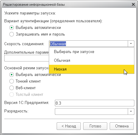 Более полные сведения об особенностях режима низкой скорости соединения приведены в документации по платформе «1С:Предприятие 8».