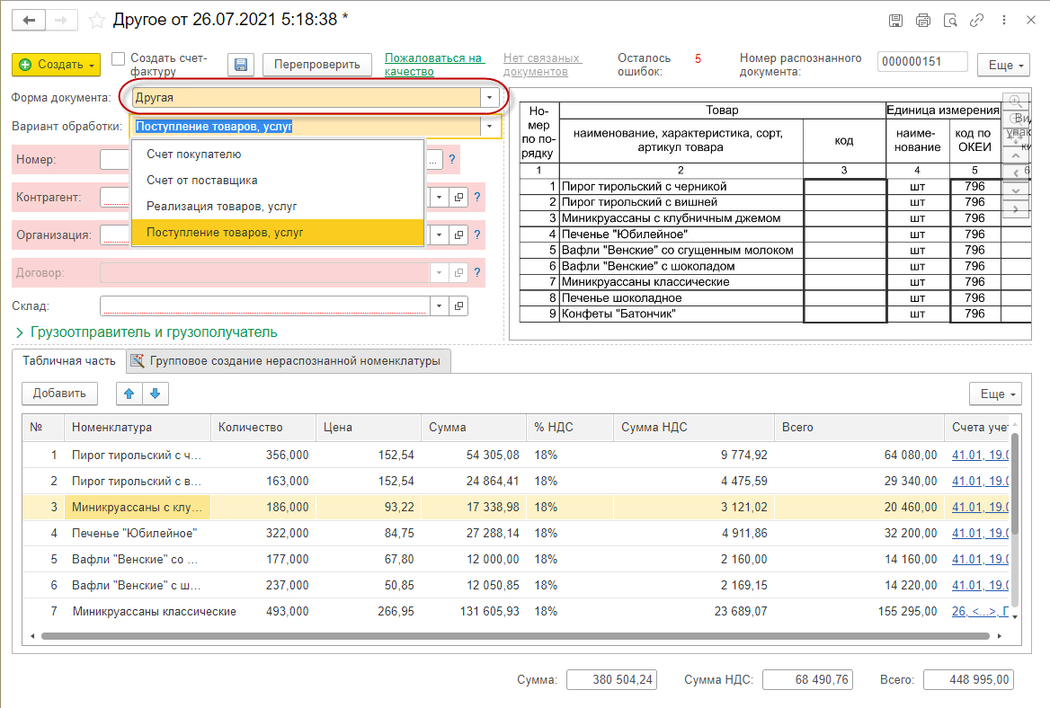 Так, например, отсканированный список номенклатуры система не может автоматически определить как учетный документ. Но этот список после распознавания вполне можно использовать, например, для создания поступления товаров или счета поставщика, выбрав соответствующий вариант обработки документа.