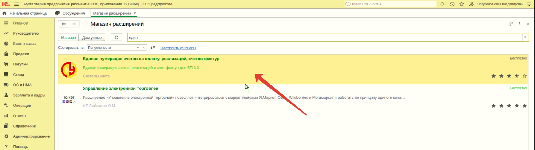 Расширение «Единая нумерация счетов на оплату, реализаций, счетов-фактур» можно установить в ваше приложение по прямой ссылке. Перейдите по этой ссылке и нажмите «Установить» в интересующей базе.
