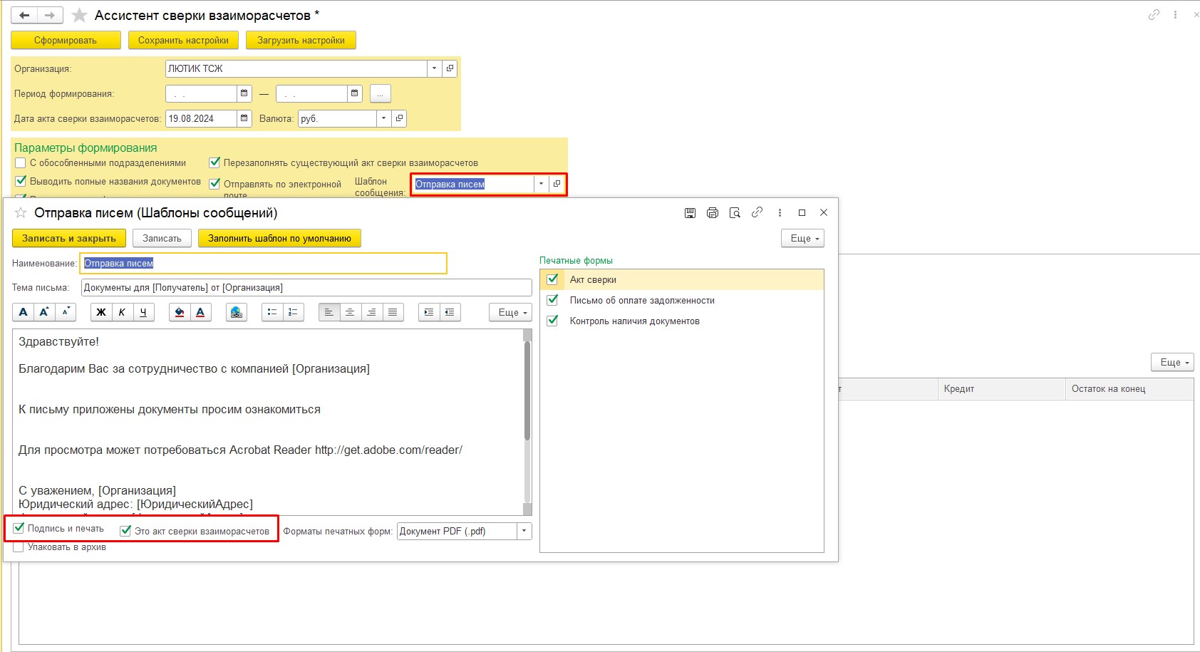 После того, как сформируется список контрагентов, по нажатию кнопки «Сформировать» будут созданы акты сверки и, если установлены соответствующие настройки, письма электронной почты.