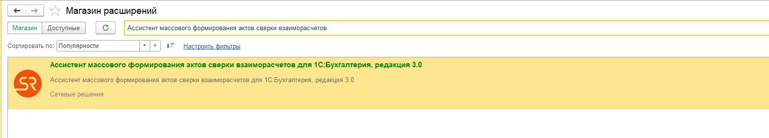 Расширение «Ассистент массового формирования актов сверки взаиморасчетов» можно установить в ваше приложение по прямой ссылке. Для установки в облачные программы 1С:Управление нашей фирмой и 1С:Розница 3.0 перейдите по этой ссылке, для установки в другие программы – по этой ссылке, и нажмите «Установить» в интересующей базе.